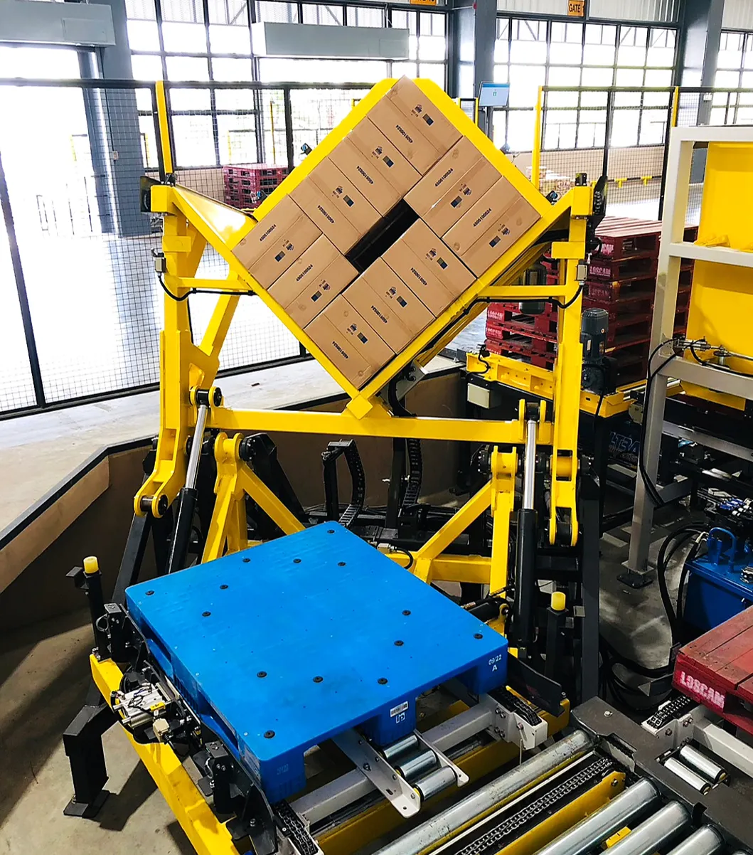 The automatic pallet changer is designed according to customer needs to reduce the steps and labor required to move products from plastic pallets to re-arrange them on wooden pallets to ship them overseas.