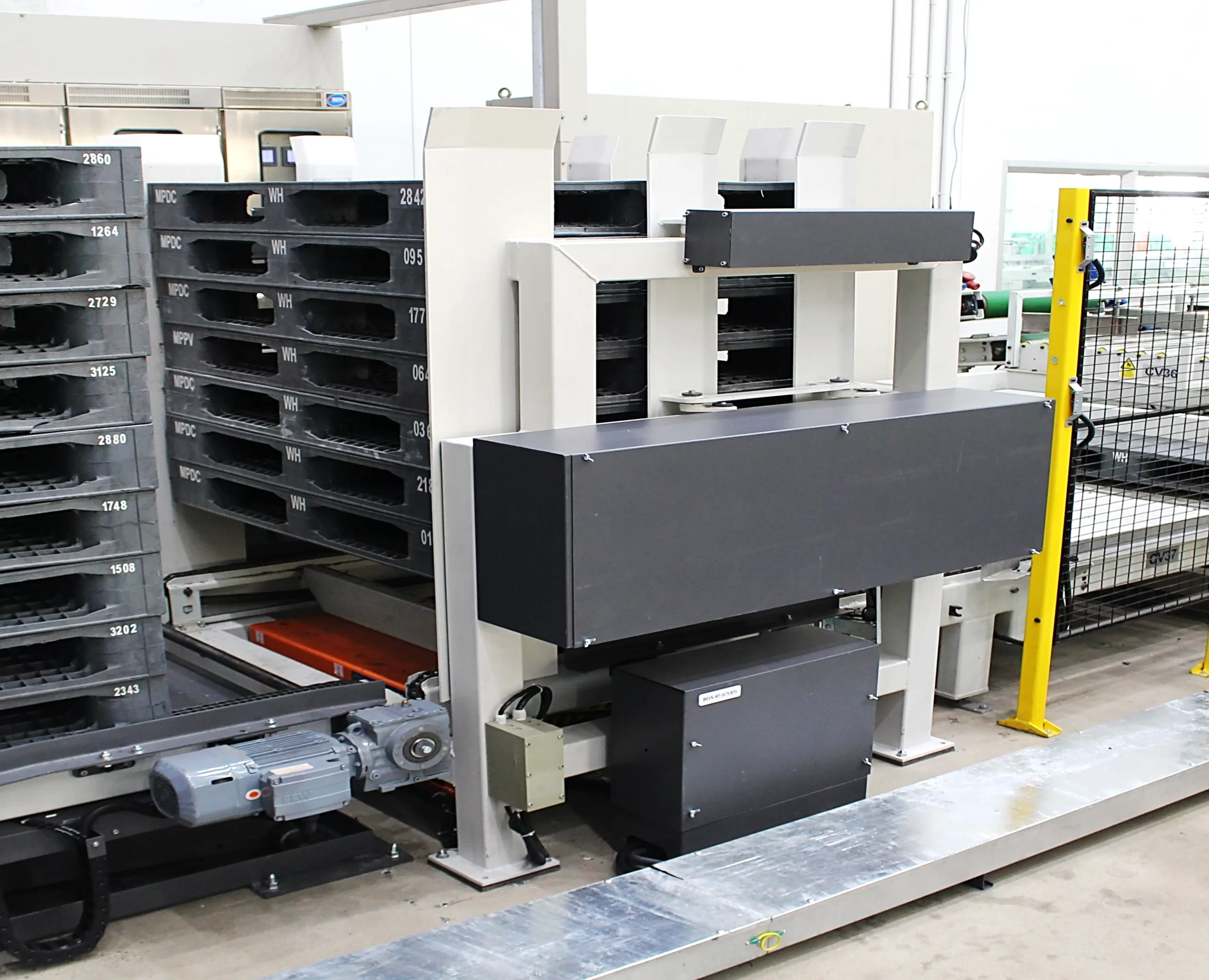 - เครื่องจ่ายพาเลทช่วยให้พาเลทพร้อมเสมอสำหรับเครื่องจัดเรียงสินค้าแบบหุ่นยนต์หรือแบบธรรมดาเพื่อเติมสินค้า